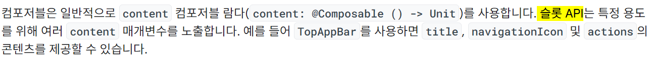 BottomAppBar도 TopAppBar와 동일하게 기본적으로 AppBar를 구현하여 만든다. @Composable fun BottomAppBar( modifier: Modifier = Modifier, backgroundColor: Color = MaterialTheme.colors.primarySurface, contentColor: Color = contentColorFor(backgroundColor), cutoutShape: Shape? = null, elevation: Dp = AppBarDefaults.BottomAppBarElevation, contentPadding: PaddingValues = AppBarDefaults.ContentPadding, content: @Composable..