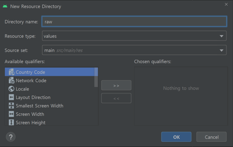 음성 파일을 res에 New Resource Directory - raw파일을 추가해서 이 raw파일 안에 음성 파일을 넣는다.