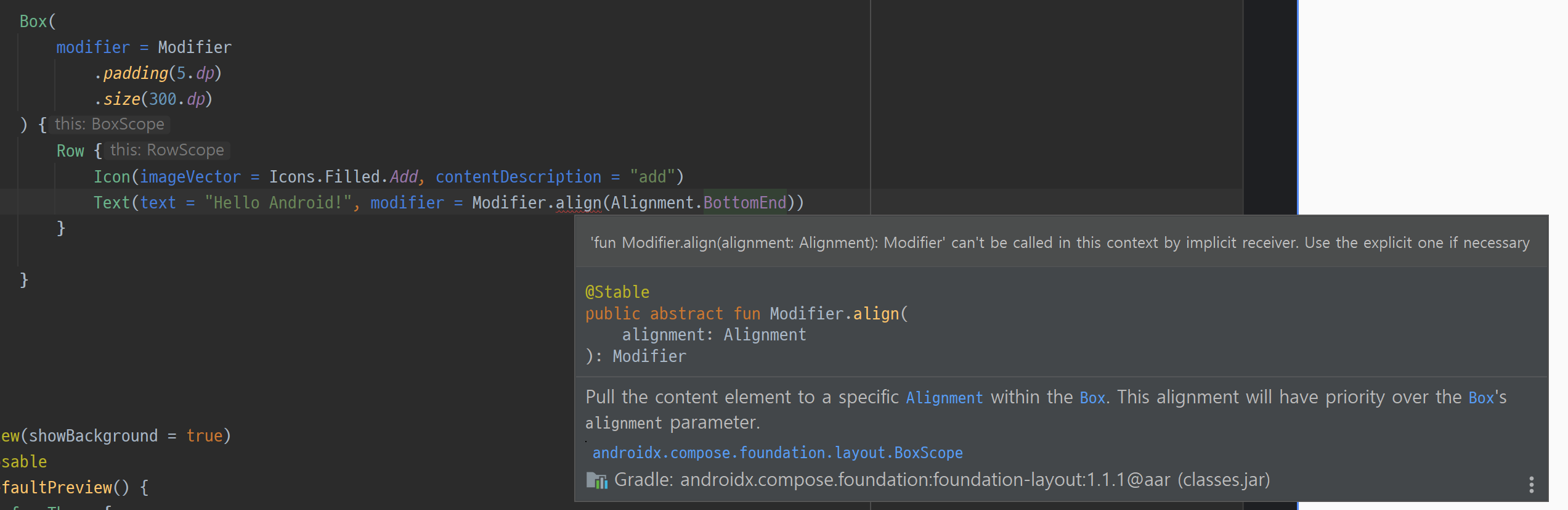 BottomEnd가 아닌 CenterVertically 등 Alignment.Verticals의 값을 사용하면 오류가 나지 않는데, Alignment는 부모 layout의 방향과 반대의 것으로 사용해야한다.