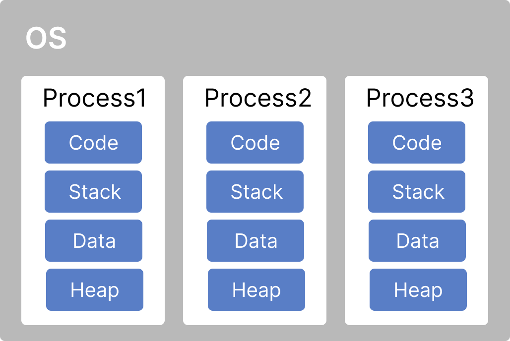 운영체제(OS)가 프로세스 마다 Code, Data, Stack, Heap 형식으로 각각 메모리 영역을 할당해주고,
