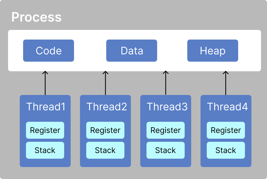 하나의 프로세스를 각각 register와 Stack을 할당받아 다수의 스레드로 나뉘고 자원(Code, Data, Heap)을 공유하여 서로 다른 스레드에서 읽고 쓸 수가 있게 된다.