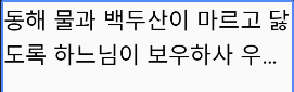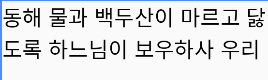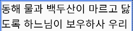 text = "동해 물과 백두산이 마르고 닳도록 하느님이 보우하사 우리나라 만세 무궁화 삼천리 화려강산 대한 사람, 대한으로 길이 보전하세",